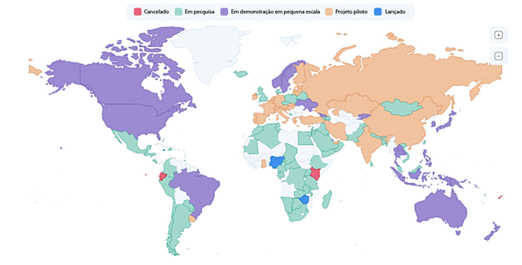 O interesse em CBDCs aumentou significativamente nos últimos anos, impulsionado por avanços tecnológicos e pela pandemia de covid-19, que acelerou a digitalização dos pagamentos. Nesse contexto, o BIS[6] realizou em 2020 uma pesquisa com 66 bancos centrais e constatou que países com economias em desenvolvimento, como Brasil, Argentina, África do Sul e China, esperam aumentar a inclusão financeira ao desenvolver uma CBDC. A Figura 1 apresenta uma visão com o mapa de países que desenvolvem CBDCs: