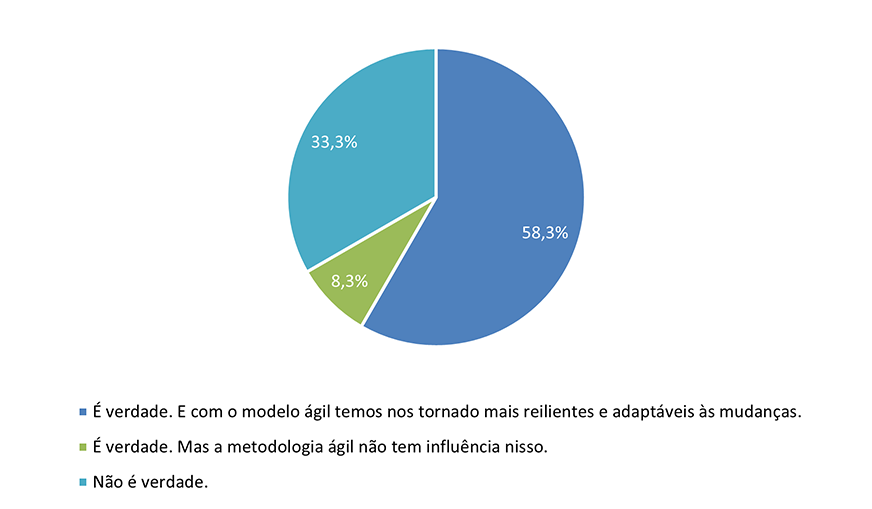 Concordam e associam (58,3%) que a aceitação a mudanças está relacionada ao modelo de trabalho ágil e apontaram que há relação entre a adoção da metodologia ágil e a possibilidade de se tornar um profissional mais preparado, através da adaptabilidade e resiliência que a agilidade promove, o que indica que estar nesse contexto promove o amadurecimento no campo da incerteza. Embora 33,3% tenham negado que as pessoas da sua empresa aceitam mudanças, não houve relação com o uso ou não da metodologia. O crescimento profissional e pessoal se faz pelo aprendizado e desafio constantes, abrindo-se para mudanças e resiliência para o contexto atual de trabalho. Percebe-se a presença do fator “Crescimento” de Herzberg[8], ao apontar para o alcance da maturidade pessoal através das atitudes funcionais do profissional no trabalho[14].