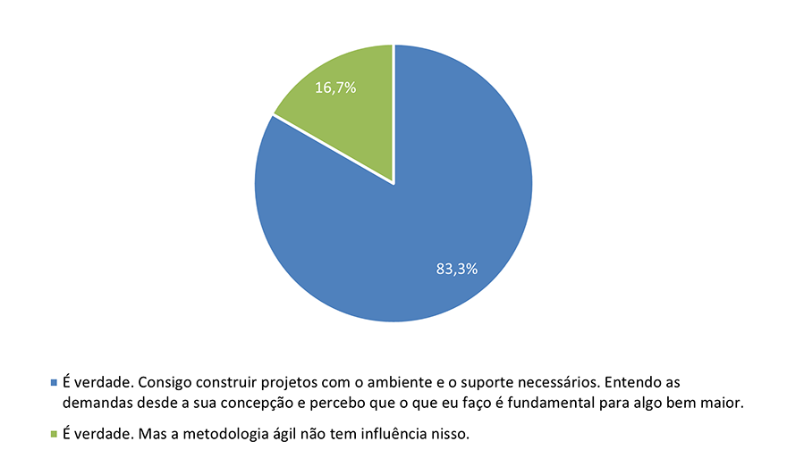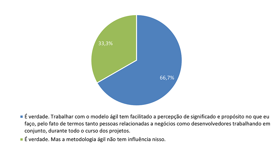 Dois terços (66,7%) dos entrevistados concordam, associando a percepção de significado no trabalho à utilização do modelo ágil. Essa afirmação foi utilizada como referência a um dos princípios ágeis: “tanto pessoas relacionadas a negócios como desenvolvedores devem trabalhar em conjunto durante todo o curso do projeto”, o que indica a metodologia como facilitadora no alcance de significado no trabalho, ao proporcionar a interação constante entre profissionais, o que estimula o envolvimento desses perfis técnicos no propósito do produto final[5]. Isso leva os profissionais a adotarem uma visão integrada, alinhando negócio com tecnologia. O alinhamento cria um ambiente colaborativo e multidisciplinar, onde os profissionais trabalham em conjunto e a interação legitima o significado do esforço aplicado, além de estimular o entusiasmo, mesmo em situações desafiadoras[5].