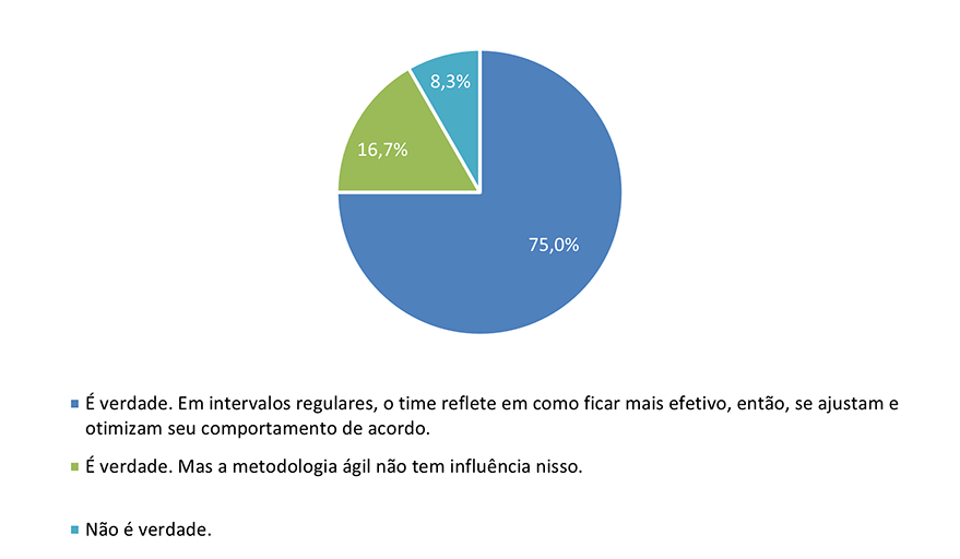 A maioria, 75,0%, participa de reuniões de feedback, 8,3% não participa e 16,7% participa, mas não associa à utilização da metodologia ágil. Conclui-se esta seção com a percepção do feedback como um método associado ao reconhecimento, princípio este destacado por Herzberg[8], ao ressaltar a importância do reconhecimento do trabalho realizado pelos profissionais, através de conversas francas ou feedback contínuo, que também é enfatizado pelo manifesto ágil para o sucesso do projeto. O feedback deve ser fornecido em intervalos regulares, a fim de possibilitar a reflexão sobre melhorar sua eficácia, ajustar e otimizar seu desempenho. Essas práticas demonstram a importância desses momentos como oportunidades para reconhecer os sucessos quanto às áreas que precisam melhorar, enquanto cada profissional participa e compartilha a responsabilidade nesse contexto[5,14].