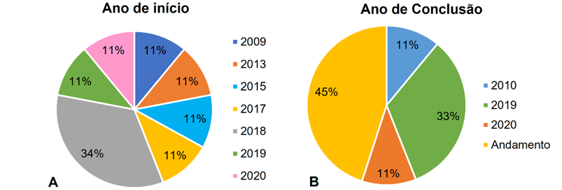 Figura 1. Gráficos mostrando os anos de início das negociações e ano de conclusão e lançamento das tecnologias co-desenvolvidas entre a Embrapa e empresas parceiras. 1A: mostra os anos de início das negociações e a frequência em cada ano; 1B: mostra os anos de conclusão das tecnologias co-desenvolvidas e a frequência em cada ano