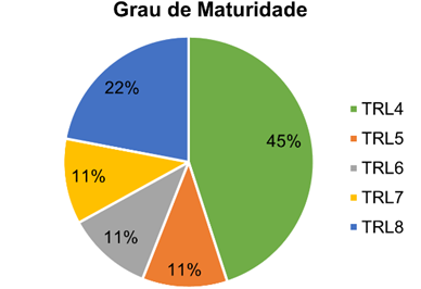 Figura 2. Gráfico mostrando as o grau de maturidade das tecnologias em Technology Readiness Levels (TRLs). Essa escala utilizada pela Embrapa e outras instituições mundiais vai da TRL1 a TRL9, onde a TRL1 significa grau de maturidade mais baixo e TRL9 significa a tecnologia pronta para o mercado
