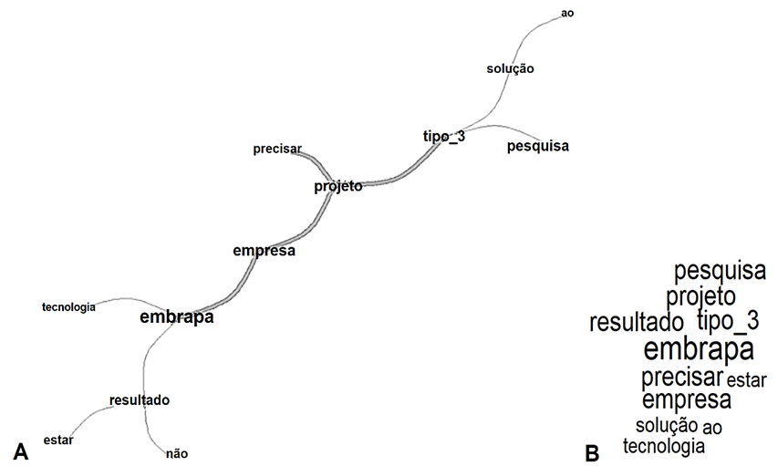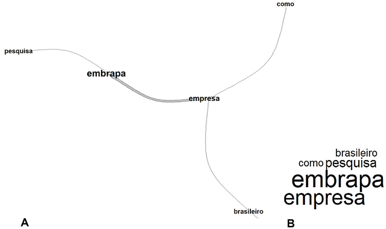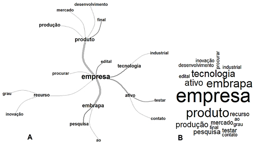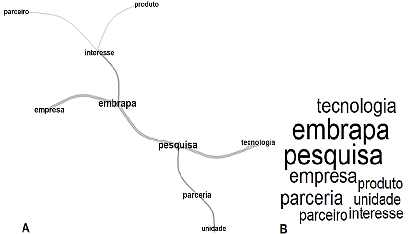 Figura 5. Gráficos de similitude e nuvem de palavras referente à pergunta: “Qual foi o motivo de ter escolhido a Embrapa para negociação de contrato para parceria de co-desenvolvimento”? (na visão das empresas). 5A. Gráfico mostrando a análise de similitude do conjunto de textos retirados das entrevistas com os participantes; 5B. Gráfico mostrando a nuvem de palavras do conjunto de textos retirados das entrevistas com os participantes