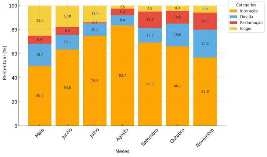 Figura 1. Porcentagem de interações no perfil do Instagram da “Empresa A” de maio a novembro de 2023