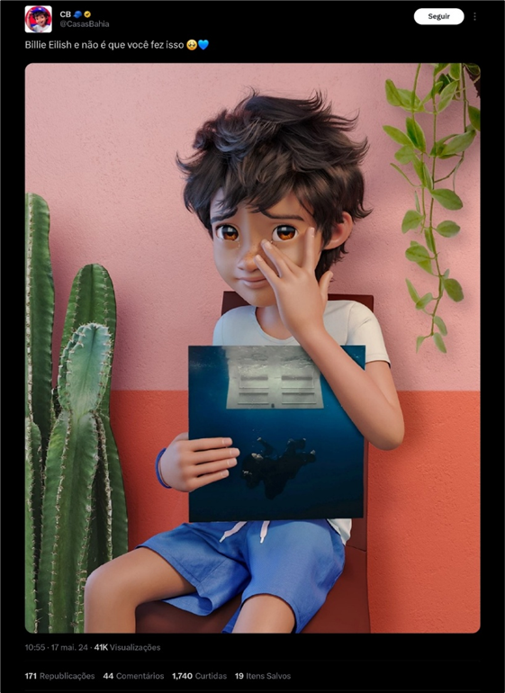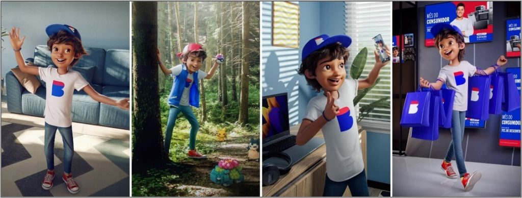 Em 2020, o Baianinho das Casas Bahia foi transformado no influenciador virtual CB, uma versão adolescente moderna representado como um menino negro com boné e smartphone (Figura 3). CB adota uma linguagem jovem, aborda sustentabilidade e diversidade, e fortalece a presença da marca nas redes sociais.