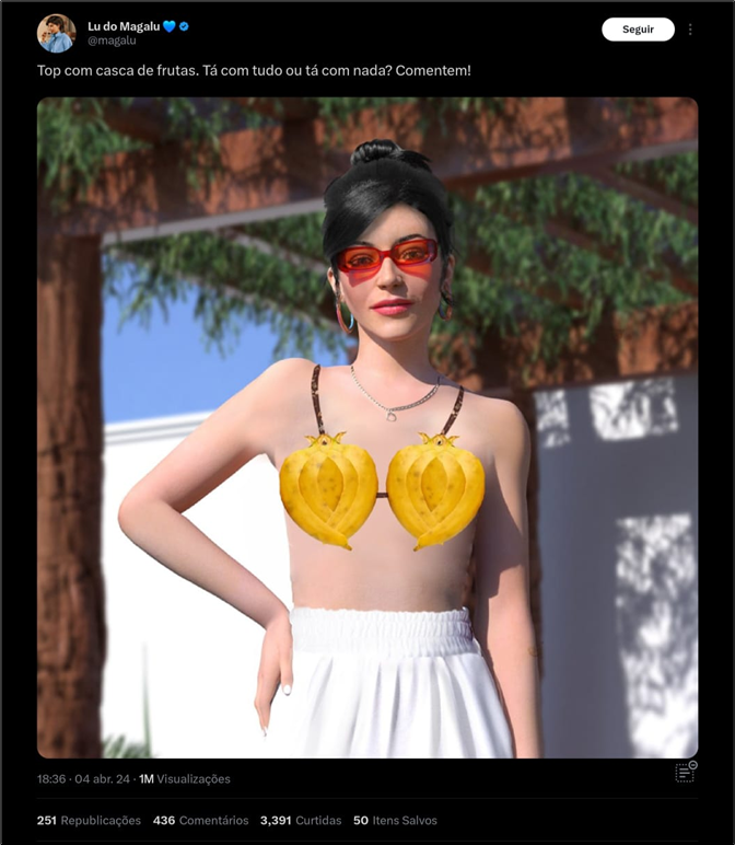 A Lu do Magalu apresenta o maior número de seguidores e engajamento, evidenciando o sucesso de sua estratégia orientada à construção de vínculos. Em sua publicação mais impactante — com 1,4 mil comentários, 694 repostagens, 3,4 mil curtidas e mais de 1 milhão de visualizações (Figura 4) — houve predominância de comentários sociais entre os mais curtidos (99 em 100). Isso reforça sua capacidade de promover identificação simbólica e afetiva com o público, demonstrando o potencial dos influenciadores virtuais na criação de conexões emocionais significativas.