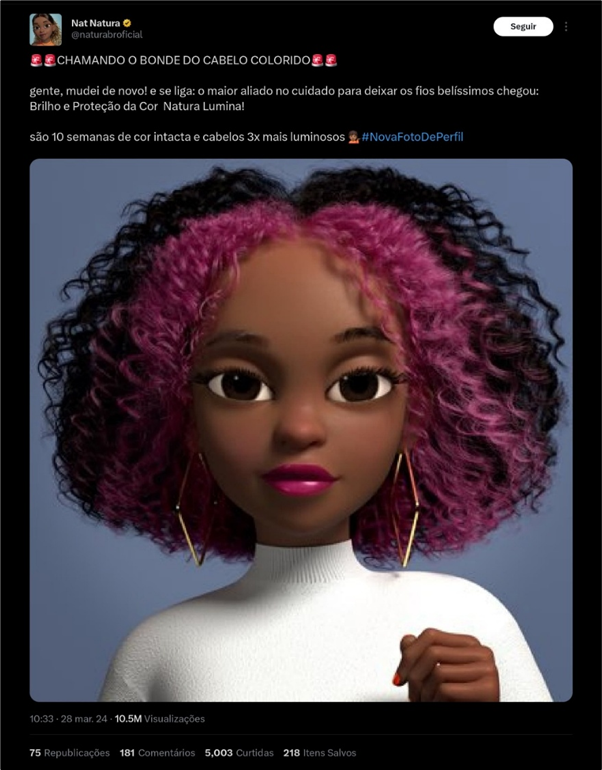 Criada em 2016 como chatbot pela Natura, a persona digital Nat foi expandida em 2018 para representar os valores da marca e, em 2019, tornou-se a “face” da empresa no X (Figura 2). No X, Nat interage com usuários e influenciadores virtuais para humanizar a marca, gerar identificação com clientes e revendedoras, e promover publicidade orgânica.