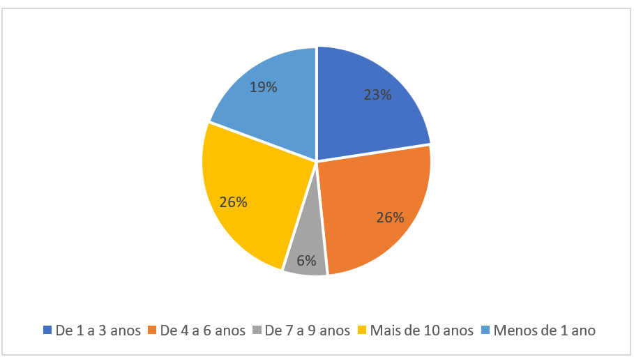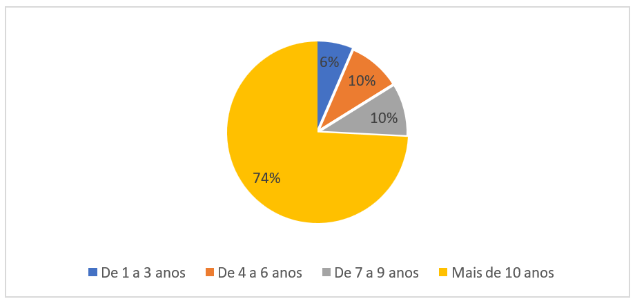 Mediante a aplicação do questionário, foi possível traçar um perfil dos 46 participantes da pesquisa, tendo como referência as informações apuradas na primeira seção de questões às quais os respondentes foram submetidos. Verificou-se que 58% deles trabalhavam em instituições de ensino públicas, 74% tinham mais de dez anos de experiência na área de educação (Figura 1), e 32% trabalhavam como gestores escolares havia pelo menos sete anos (Figura 2).