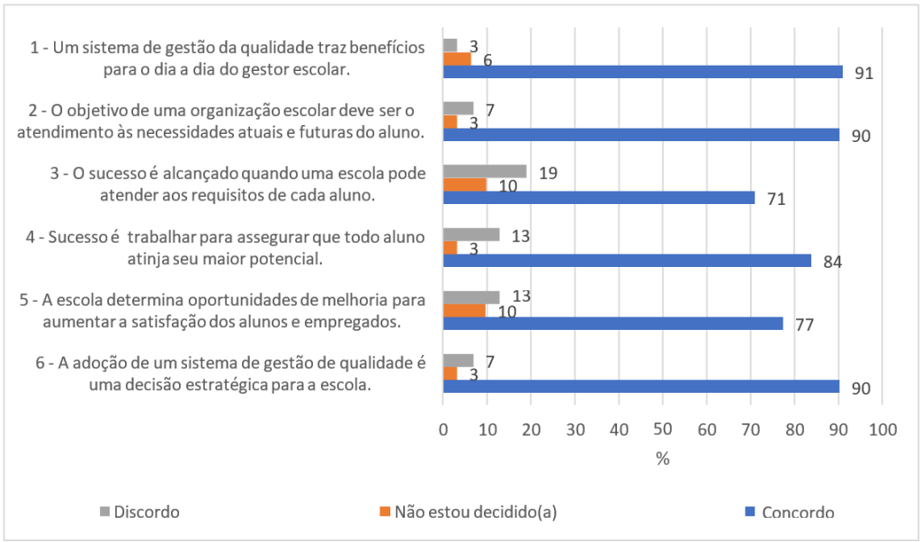 A terceira seção abordou a gestão da qualidade no dia a dia dos gestores escolares. Nesse bloco, os respondentes encontravam afirmações, extraídas de trechos da norma ISO 21001[7], e deveriam demonstrar seu grau de concordância ou discordância sobre elas. A Figura 4 representa as questões contendo as afirmações sobre a gestão da qualidade no ambiente escolar.