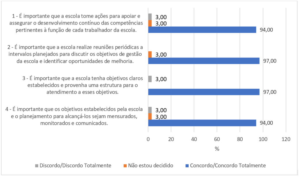 Perguntados sobre a importância de a escola realizar reuniões periódicas a intervalos planejados para discutir seus objetivos de gestão e identificar oportunidades de melhoria, 97% concordaram com a afirmação (Figura 5). Essas reuniões periódicas são determinadas pelo subitem 9.2 da norma ISO 21001[7], a exemplo das auditorias internas que provêm informações sobre o sistema de gestão da organização escolar.