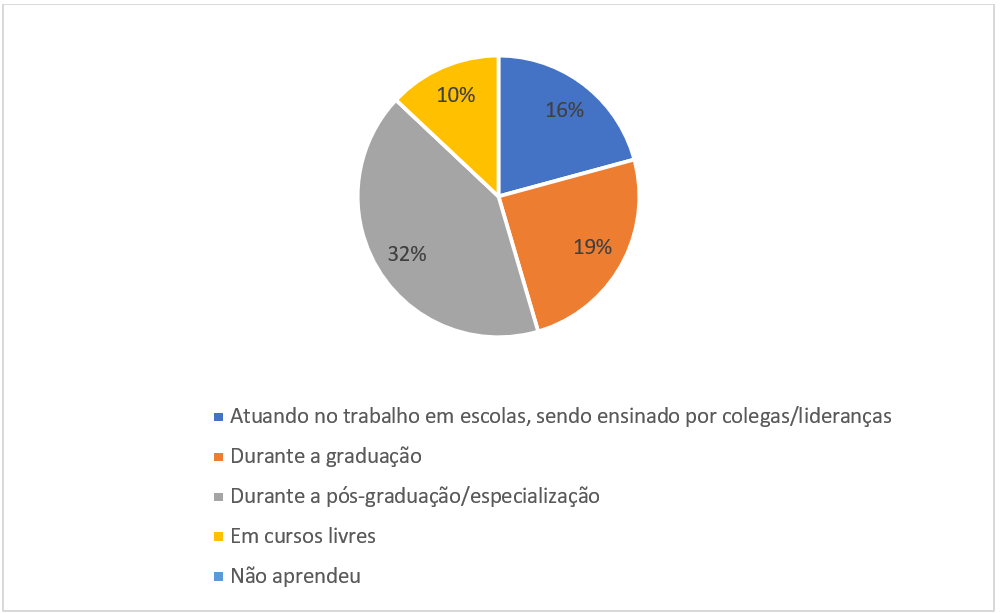 Na quinta e última seção do questionário, os respondentes foram perguntados sobre as normas da série ISO para a gestão de qualidade. Questionados sobre o momento de sua formação em que tiveram contato com normas da série ISO relativas à gestão de qualidade, 26% afirmaram que tiveram contato fora do ambiente acadêmico; 10%, em cursos livres; e 16%, atuando no mercado de trabalho. Outros 23% não tinham conhecimento sobre as normas de gestão (Figura 6).