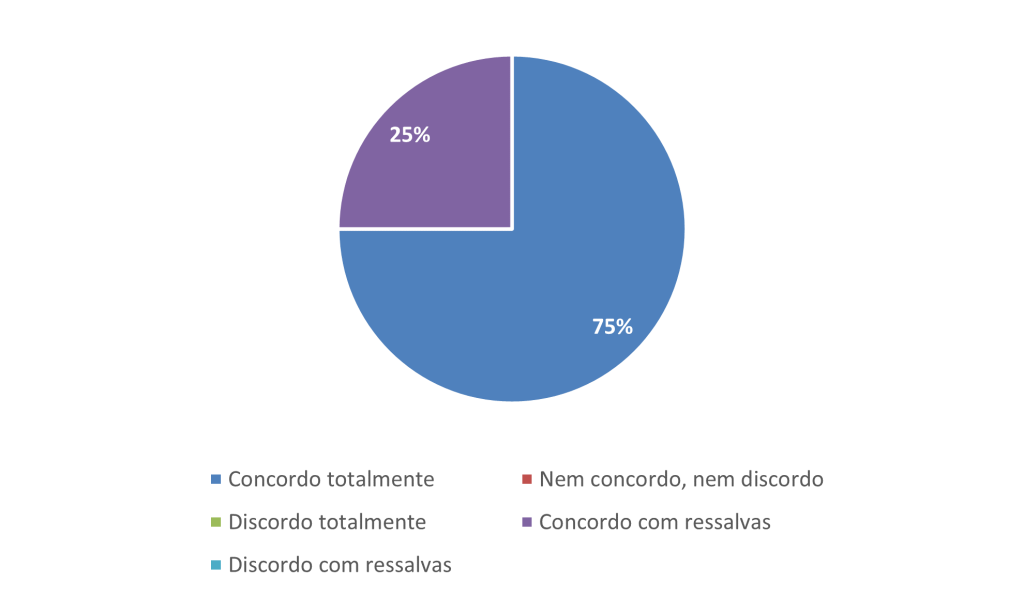 Em relação ao grau de adesão dos distribuidores em um cenário de mudança de rota logística a partir da zona franca do Uruguai, observou-se que todos demonstraram interesse (100%). Questionados a respeito da possibilidade de redução de custos caso os processos de importação ocorressem a partir do Uruguai, 100% dos respondentes concordaram totalmente. Eles também foram unânimes na opinião de que haveria melhoria nos prazos de entrega. Houve uma pequena divisão apenas quando questionados sobre o grau de concordância com a afirmação: “Com a existência de um centro logístico da empresa dentro da Zona Franca do Uruguai, meus negócios seriam certamente alavancados na região, com ganho de margem, aumento de market share e clientes mais satisfeitos.”. Apesar de 100% dos respondentes terem concordado com a afirmação, 75% o fizeram sem ressalvas, e 25%, com ressalvas (Figura 4).