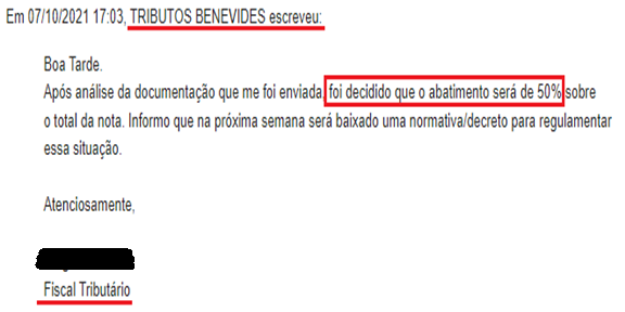 Diante do exposto, o fisco do município A, localizado no interior do estado do Pará, concedeu abatimento de 50% sobre o valor total da prestação de serviços, sem necessidade de comprovação da origem do material aplicado. Ou seja, o abatimento foi majorado independentemente de sua obtenção ter ocorrido por produção própria ou por aquisição de terceiros. Essa confirmação pode ser observada nas trocas de e-mails apresentadas na Figura 4.