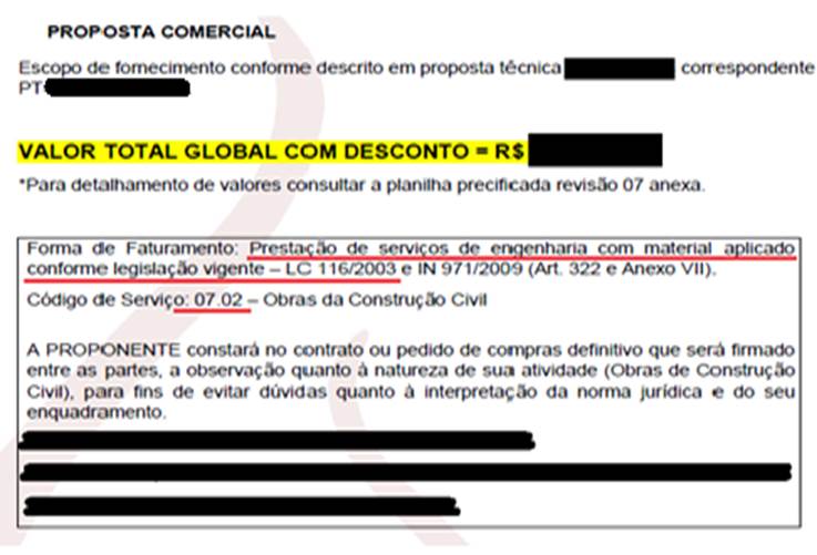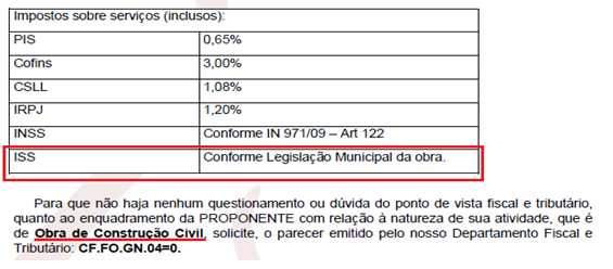 Em outro campo da proposta comercial, em que os impostos incidentes na prestação de serviços são informados ao cliente, há mais uma demonstração de conhecimento da legislação aplicada ao ISS. A proposta reforça que o imposto será calculado conforme a legislação municipal do local da obra, com referência ao art. 3º, inciso III, citado anteriormente, bem como ao enquadramento da obra como atividade de construção civil, e inclui ainda um documento interno, conforme apresentado na Figura 2.