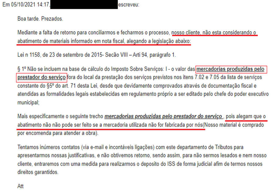 Com isso, e com a finalidade de resguardar o direito de abater os materiais aplicados e de respaldar o cliente final, foi informado, como última medida, que o valor do ISS seria depositado judicialmente, enquanto a discussão com o município seria conduzida. Todas as informações citadas podem ser observadas na Figura 3, extraída da troca de e-mails entre o fornecedor, o cliente final e a prefeitura (fiscal de tributos).