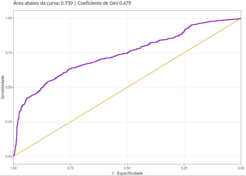 A área abaixo da curva ROC é um índice importante para avaliação global do modelo, pois mostra graficamente a relação entre especificidade e sensitividade para diferentes valores “cutoff”; dentro deste contexto, o modelo apresentou uma área abaixo da curva ROC de 73,9%, conforme é possível observar na Figura 2.