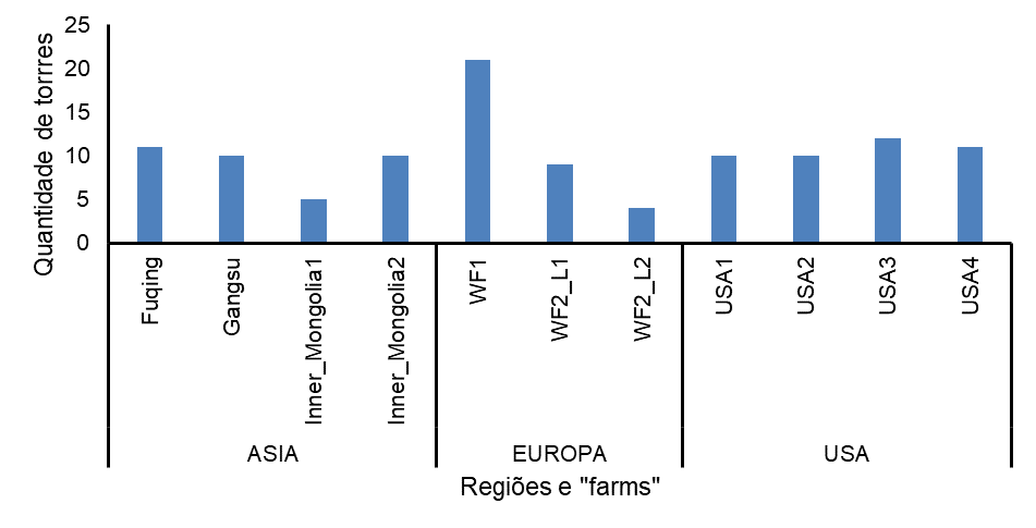 A pesquisa analisou um total de 117 torres eólicas. Estas torres estão distribuídas em parques que contêm até 11 torres cada e estão localizadas em três continentes distintos: Ásia, Europa e América do Norte. Vale destacar que uma única região geográfica pode abrigar várias “farms”. Por exemplo, a Europa, tem-se as “farms” WF1, WF2_L1 e WF2_L2, como ilustrado na Figura 3.