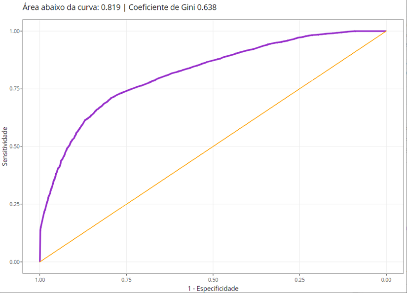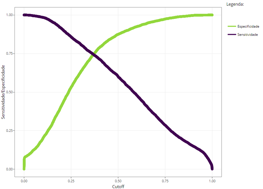 Com o melhor “cutoff” definido, pôde-se então gerar a matriz de confusão e os parâmetros para avaliação do modelo, como os valores de sensitividade, ou seja, o quão acurado é o modelo ao classificar os eventos, e a especificidade, ou seja, o quão acurado é o modelo em evitar falsos positivos. Ressalta-se o acréscimo considerável da sensitividade em relação ao modelo logístico binário (cerca de 71,8% de acréscimo), enquanto a especificidade teve uma pequena retraída. A Tabela 10 mostra a matriz de confusão e os parâmetros de avaliação.