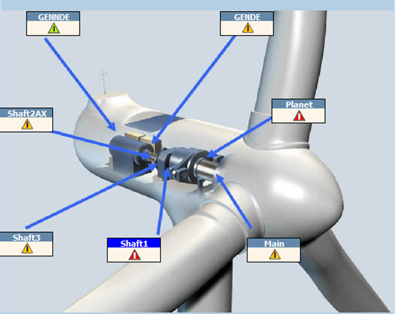 Os pontos de medição são determinados por meio dos mancais de eixo mais importantes de todo o equipamento. Um acionamento de um aerogerador é definido por[9]: