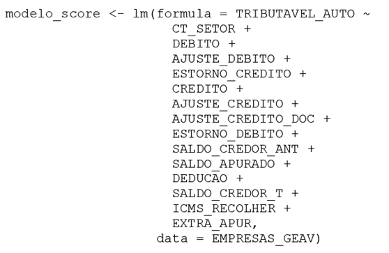 A normalização das variáveis e a execução inicial do modelo, por meio do comando lm (Figura 1), revelaram a presença de parâmetros sem significância estatística, o que indicou a necessidade de refinamento. Para incluir no modelo final apenas variáveis com influência estatisticamente significativa sobre o resultado, foi aplicado o procedimento stepwise[14], que avalia e remove gradualmente as variáveis sem contribuição relevante.