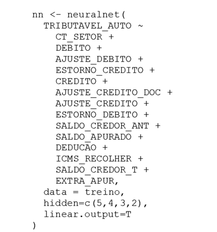 O desenvolvimento dos algoritmos ocorreu no programa R, com as bibliotecas tidyverse, rgl, jtools, Rmisc, caret, neuralnet aplicadas no processamento e análise dos dados. Os dados trabalhados não apresentam identificação do contribuinte e os valores estão totalizados para impossibilitar sua identificação, em consonância com as normas específicas de sigilo fiscal.