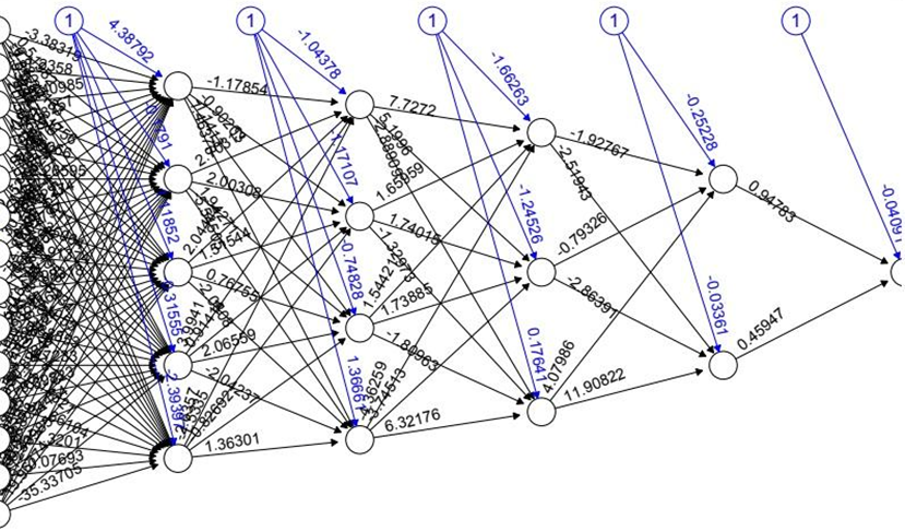 O primeiro passo na aplicação do modelo de redes neurais no caso em estudo consistiu na normalização das variáveis, seguida da divisão da base em 70% para treino e 30% para teste. O próximo passo foi a execução do algoritmo de redes neurais, demonstrado na Figura 3. Foram testadas várias combinações de variáveis explicativas e hiperparâmetros. Assim como no modelo de random forest, os melhores resultados ocorreram quando a variável AJ_DEBITO_DOC foi desconsiderada, pois mostrou ser irrelevante para o modelo. A combinação de hiperparâmetros que apresentou melhor desempenho inclui quatro camadas intermediárias: a primeira com cinco neurônios, a segunda com quatro, a terceira com três e a quarta com dois, conforme arquitetura do modelo apresentada na Figura 4, e a utilização de uma função de ativação na saída.