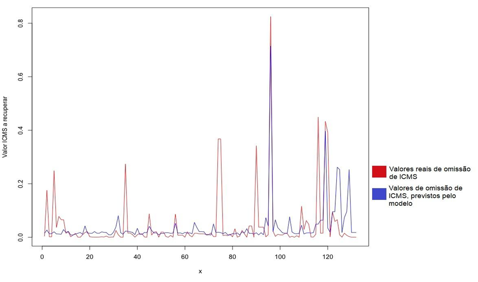 em vermelho, os valores reais de omissão de ICMS, ou seja, os valores de ICMS autuado em ações fiscais, e, em azul, os valores de ICMS omissos previstos pelo modelo na base de teste.