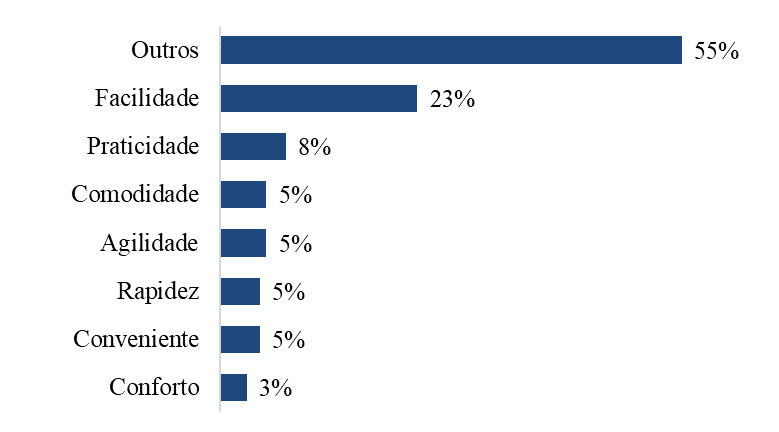 Apesar disso, de acordo com os respondentes, as palavras que melhor descreveriam o termo ultraconveniência são: facilidade (23%) e praticidade (8%), outras palavras citadas corresponderam a 55% das menções, como aponta a Figura 5 abaixo.