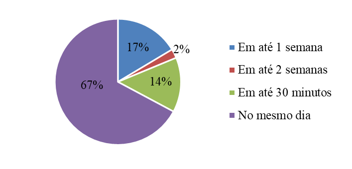 Dentre os respondentes, 67% consideraram como uma entrega super-rápida aquela que recebem o produto no mesmo dia da compra e 14% consideram quando a entrega é realizada num intervalo de até 30 minutos, o que define o conceito de ultraconveniência. Em contrapartida, ainda há uma grande parcela de pessoas (17%) que acreditam que uma entrega super-rápida é aquela em que o produto é entregue em até uma semana, como mostra a Figura 6.