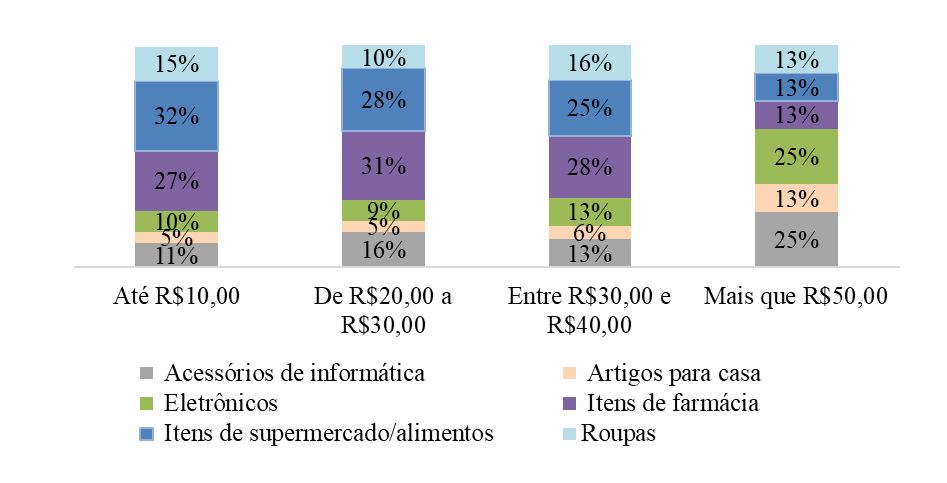 Por fim, dentre as categorias avaliadas, itens de supermercado/alimentos (30%) e itens de farmácia (29%) foram as mais escolhidas pelos respondentes como as que estariam dispostos a pagar um custo extra para receber suas compras mais rapidamente. Por outro lado, as categorias em que os consumidores estariam dispostos a pagar mais caro, isto é, mais do que R$ 50,00, foram as de produtos eletrônicos (25%) e acessórios de informática (25%), como é possível verificar na Figura 11.