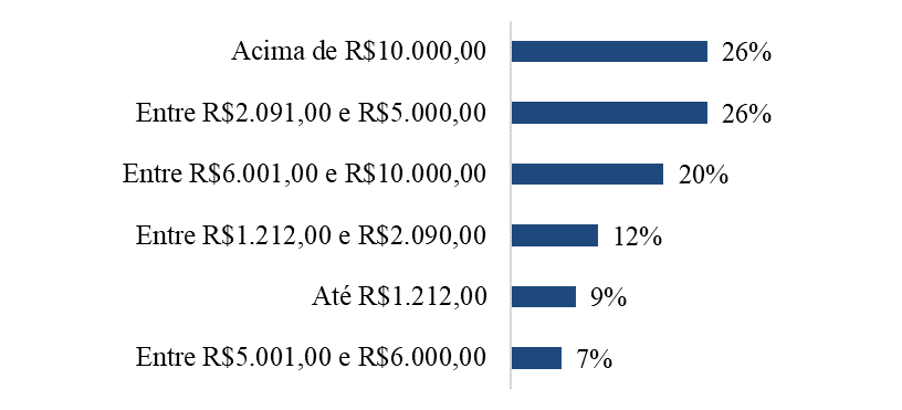 Ao serem questionados sobre se estariam ou não dispostos a pagar por uma entrega mais rápida, em até 30 minutos, 80% dos participantes afirmaram que sim. Dentre esses, 39% possuíam entre 18 e 25 anos, e 21%, entre 31 e 40 anos. Em relação à renda mensal dos que estariam dispostos a pagar esse custo extra, 26% recebiam um salário acima de R$ 10.000,00, e outros 26% recebiam um salário de até R$ 5.000,00, como é possível verificar na Figura 8.