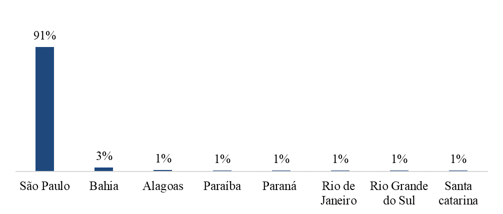 Já em relação ao estado de residência, 91% das pessoas que responderam à pesquisa residiam no estado de São Paulo, 3% na Bahia, 1% em Alagoas, 1% na Paraíba, 1% no Paraná, 1% no Rio de Janeiro, 1% no Rio Grande do Sul e 1% em Santa Catarina, como mostra a Figura 2.