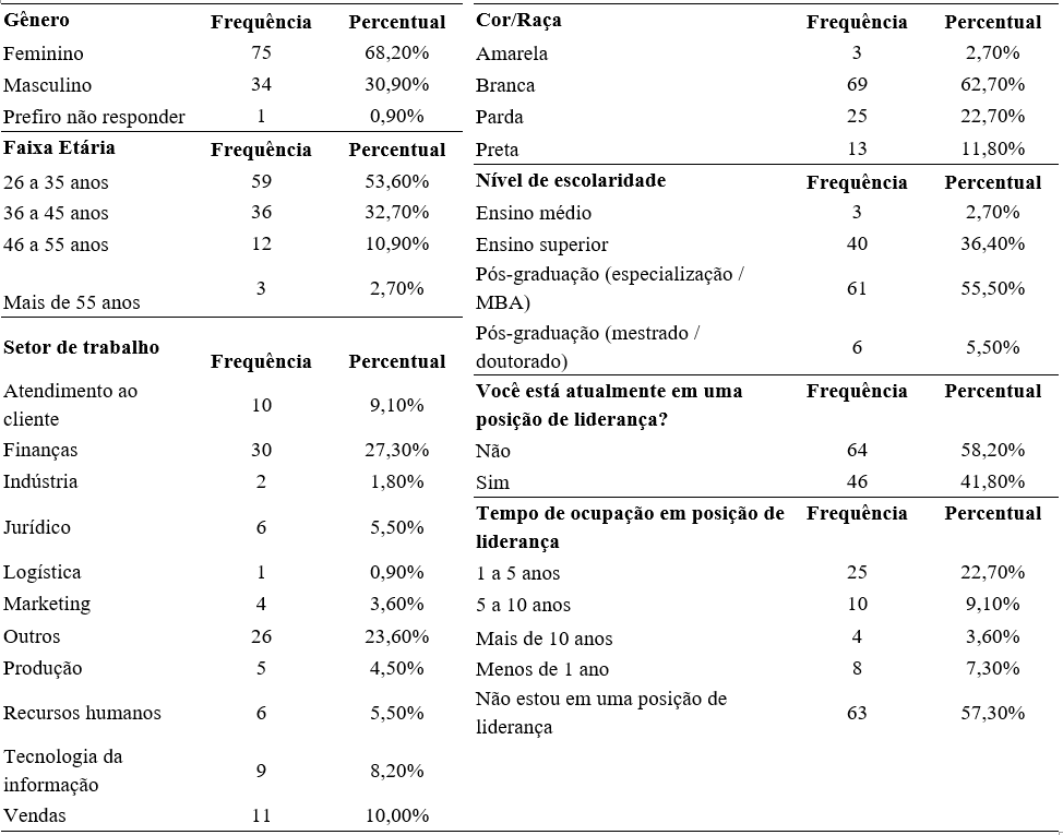 Publicou-se uma postagem aberta nas mídias sociais, a qual convidou profissionais de diferentes setores, entre eles funcionários e gestores, a participar da pesquisa. Os critérios de inclusão foram atuar no mercado de trabalho e ter idade igual ou superior a 18 anos. Utilizou-se uma técnica de amostragem não probabilística por conveniência[16], o que resultou em 110 respostas. Para ampliar o alcance da pesquisa, foram realizadas postagens sucessivas com tom convidativo, a fim de reforçar a chamada a profissionais atuantes no mercado de trabalho.