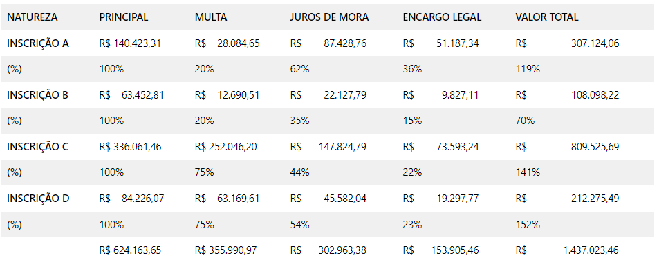 Foram lavrados dois autos de infração, resultado desta prática comumente utilizada pelos administradores, que somados apresentaram a quantia de R$ 1.021.801,18, correspondente ao valor total das inscrições de letra C e D (Tabela 1). Os documentos inerentes a essa constatação — tais como notificações, auto de infração e imposição de multa, autuações e inscrições em dívida ativa — dão suporte ao montante autuado, devendo ser considerado, outrossim, que os valores relativos às inscrições de letra A e B (Tabela 1) dizem respeito ao adiamento equivocado dos tributos anteriormente mencionado, que quantificados e exemplificados elucidam a situação fatídica da organização na tabela a seguir:
