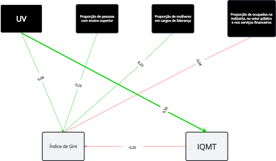 Para estudar a relação proposta, foi utilizado o modelo de equações estruturais (MEE), seguindo a lógica apresentada na Figura 1. Em adição às variáveis principais (UV, IQMT e desigualdade de renda), foram incluídas medidas de controle: proporção de pessoas com ensino superior, proporção de mulheres em cargos de liderança (“proxy” do fenômeno do teto de vidro) e proporção de ocupados na indústria, no setor público e nos serviços financeiros.