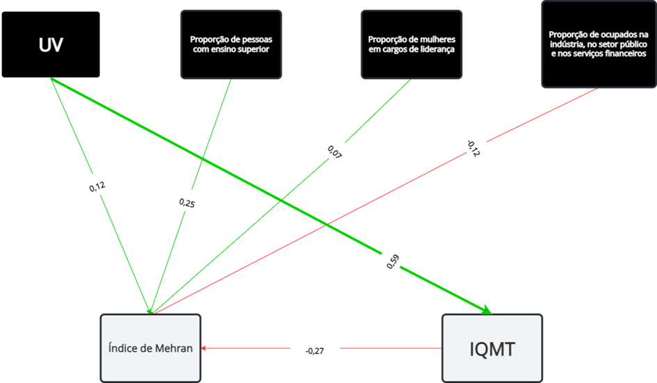 No modelo da Figura 5, nem a variável de proporção de ocupados na indústria nem a de proporção de mulheres em cargos de liderança se mostraram significativas. Seguindo a mesma lógica explorada acima, o aumento de uma unidade na medida UV leva a um aumento de 0,12 unidades no índice de Mehran, e de 0,59 no IQMT, que, por sua vez, diminui o índice de Mehran em 0,27 unidades, na média, ceteris paribus. O aumento de um ponto percentual na proporção de pessoas com ensino superior aumenta o índice de Mehran em 0,25 unidades.