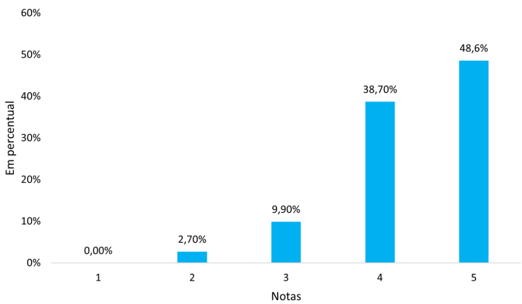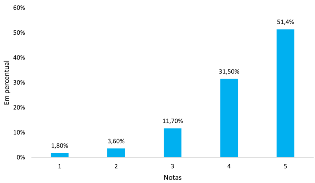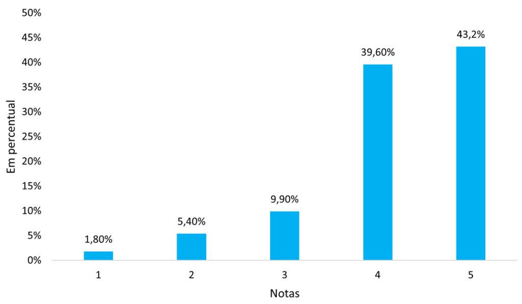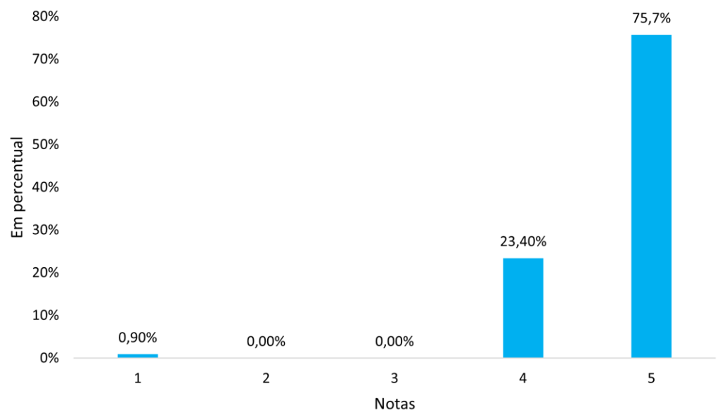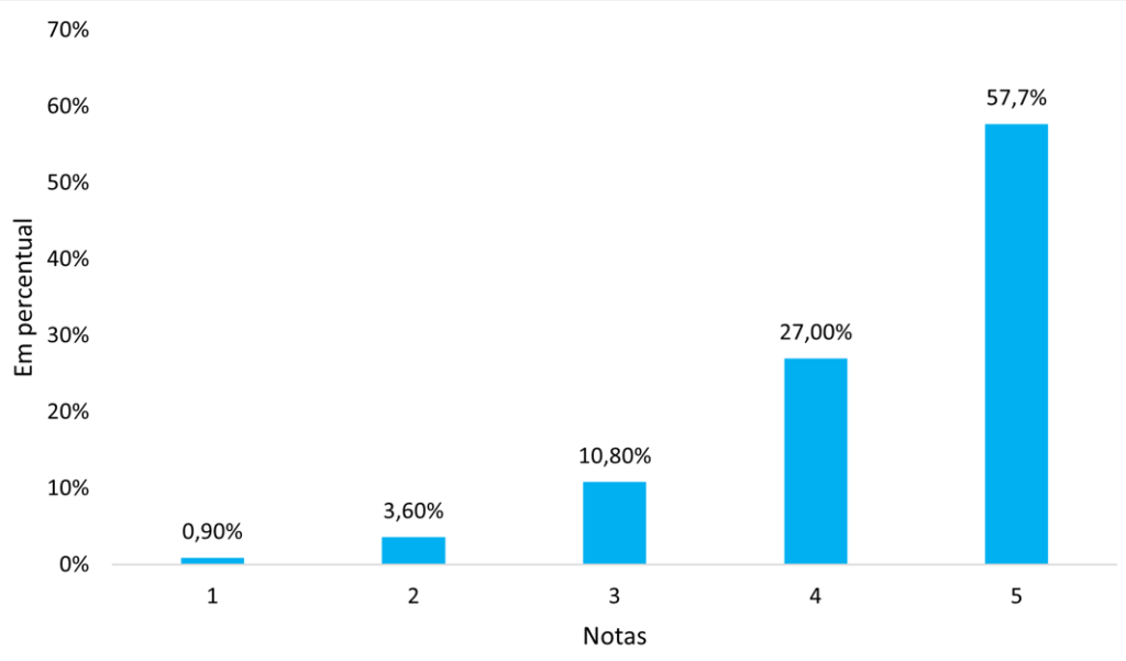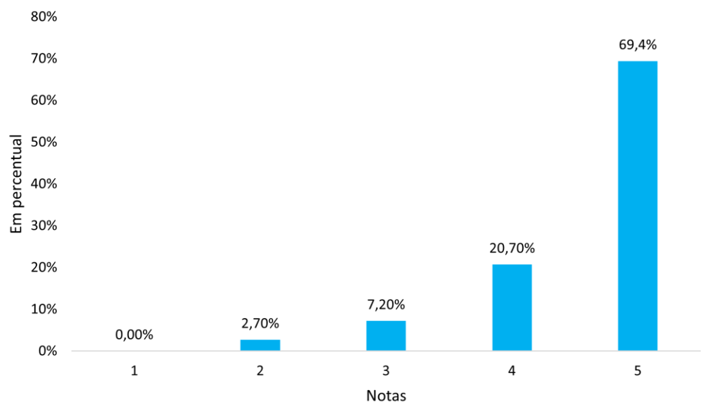 A Figura 3 destaca a forte preferência pela humanização em materiais publicitários on-line, com 75,7% dos participantes que deram nota máxima (5) e 23,4% que atribuíram nota alta (4). Há uma resistência mínima à humanização, com quase nenhuma resposta entre 1 e 3.