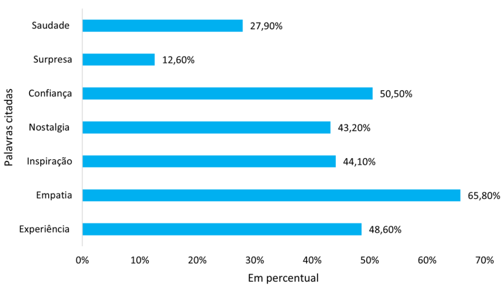 “Empatia” e “Confiança” foram as palavras mais associadas ao conceito de anúncio emocional, pois são elementos essenciais para o público. “Experiência”, “Inspiração” e “Nostalgia” também foram consideradas importantes, mas em menor grau. “Saudade” foi citada com relevância moderada, enquanto “Surpresa” apareceu como a palavra menos associada a anúncios emocionais entre as opções apresentadas. Isso indica que a criação de anúncios emocionais deve focar em gerar empatia e confiança para ressoar com os consumidores.