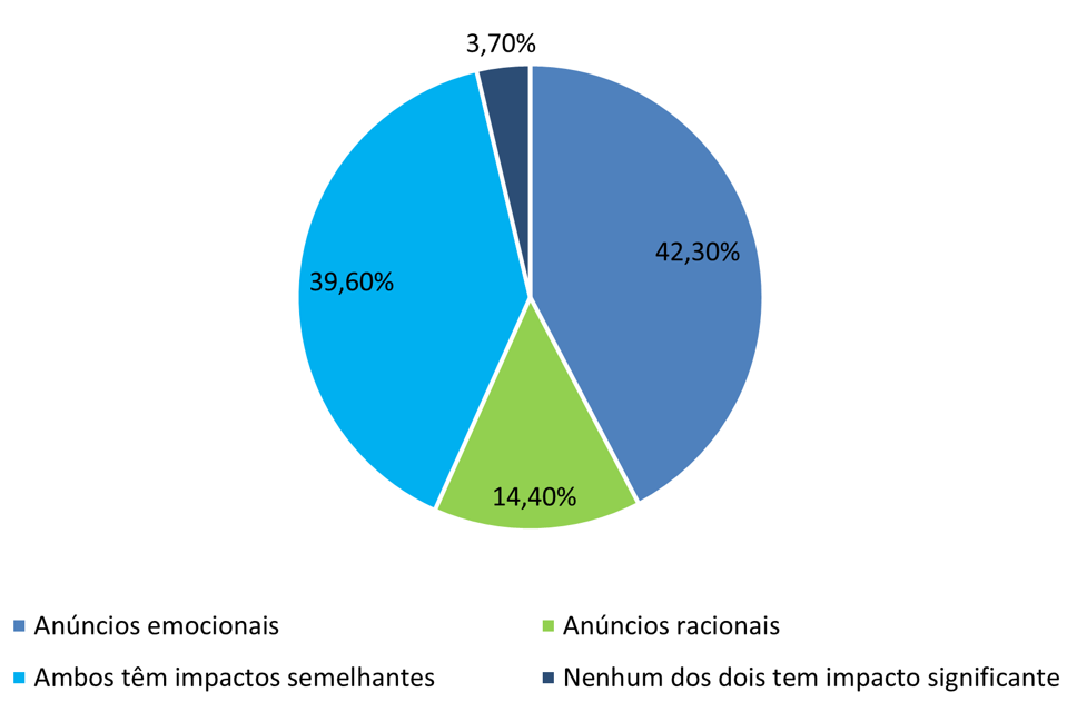 A Figura 4 compara o impacto de anúncios emocionais e racionais nas decisões de consumo. Os dados revelam que 42,3% dos participantes consideravam os anúncios emocionais mais impactantes, enquanto 14,4% demonstraram preferência pelos racionais. Além disso, 39,6% avaliaram ambos como igualmente eficazes, e apenas 3,7% perceberam pouco impacto em qualquer um dos estilos.