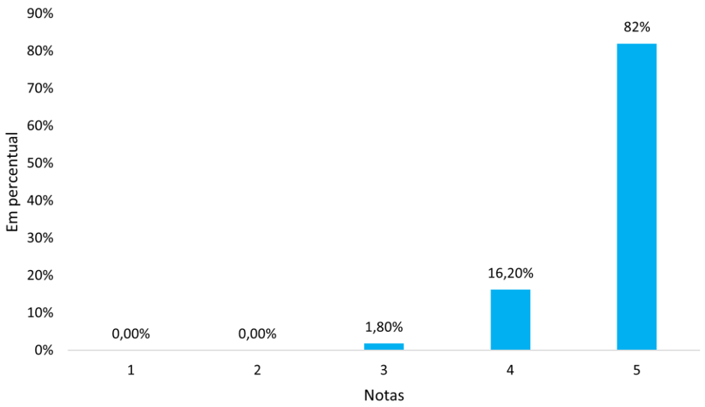 A maioria dos respondentes concordou com a afirmação de que o posicionamento de marca gera impacto importante na criação de diferenciais percebidos pelos consumidores. Sobre esse tema, 82% (91 pessoas) atribuíram nota 5, o que indica forte concordância com a ideia. Já 16,2% (18 pessoas) deram nota 4, com concordância menos enfática. Apenas 1,8% (2 pessoas) foram neutras (nota 3) e ninguém discordou (notas 1 e 2).