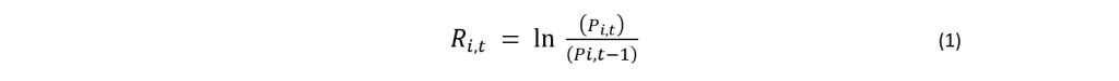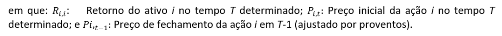 As operações de compra e venda de um ativo são negociadas por minuto, instantes ou ao longo do dia, denominadas cotações intradiárias[8]. Em vista disso, por se tratar de uma capitalização contínua, o retorno diário de um ativo ou sua rentabilidade é calculado a partir do retorno de Log, mensurado pela seguinte relação: