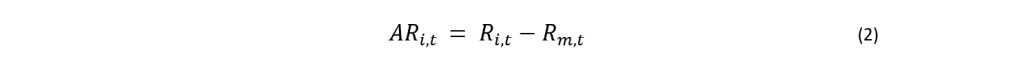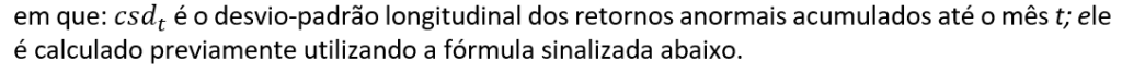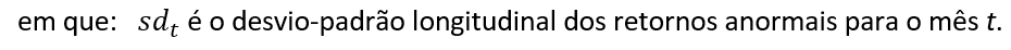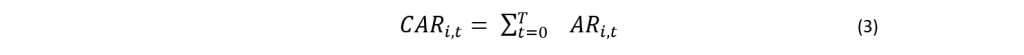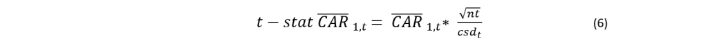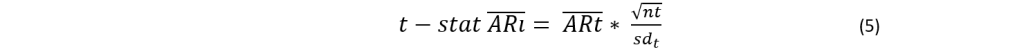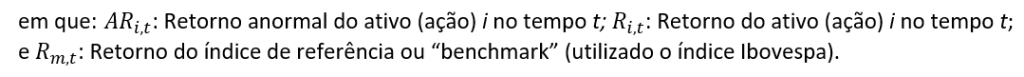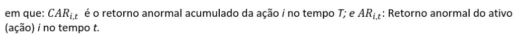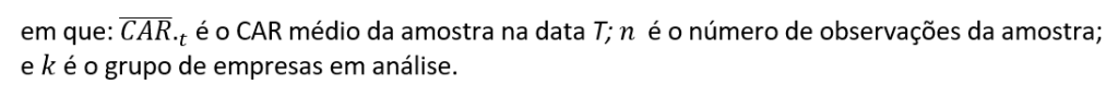 Os testes de significância estatística para AR e CAR (retornos anormais médios) foram definidos por estatística t, conforme fórmulas sinalizadas abaixo: