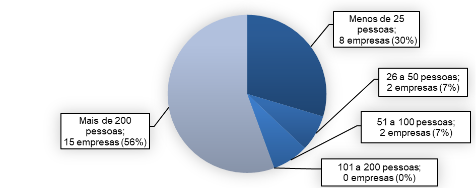 A Figura 2 evidencia que o conjunto de dados foi predominantemente composto por empresas de grande porte, isto é, aquelas com mais de 200 funcionários, as quais representaram 56% do total. Analogamente, na Figura 3, observa-se que 66% das empresas participantes possuíam mais de 25 anos de existência, indicando uma presença consolidada no mercado.