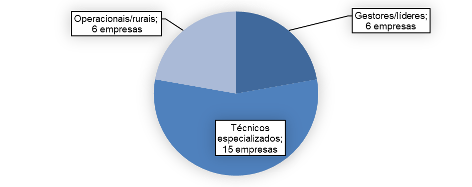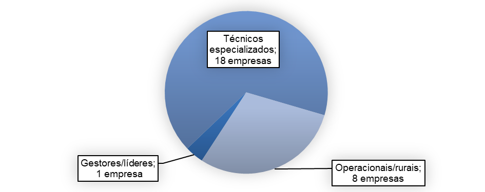 Pode-se supor, portanto, que as empresas mais consolidadas no mercado tendem a ter mais sucesso na manutenção de níveis baixos de turnover e estão experimentando crescimento, evidenciado pelo aumento do quadro de funcionários de nível superior de escolaridade, descritos aqui como técnicos especializados e gestores/líderes. A dificuldade em atrair esses profissionais também foi avaliada nesta pesquisa, questionando os participantes sobre a experiência atual na atração e retenção de profissionais talentosos, divididos em três categorias hierárquicas: profissionais operacionais/rurais, técnicos especializados e gestores/líderes. Em relação à busca por bons profissionais e à retenção deles, as empresas participantes relataram encontrar maior dificuldade com os técnicos especializados, como demonstrado nas Figuras 11 e 12.
