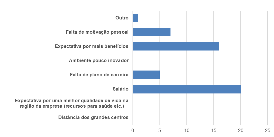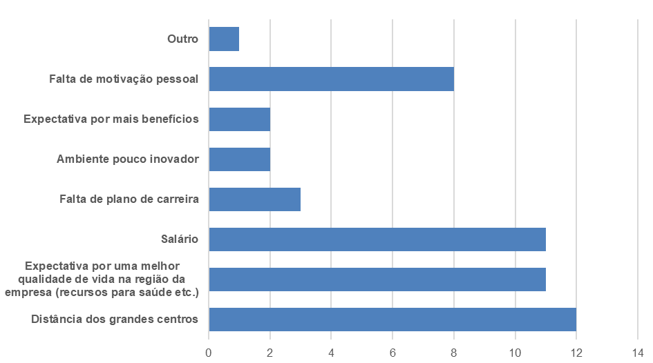 As empresas também compartilharam os principais motivos dos desligamentos voluntários (Figura 13). Em sua maioria, profissionais técnicos especializados e gestores/líderes pediam desligamento principalmente devido à localização das empresas, que, na maioria dos casos, estava distante dos grandes centros urbanos. Em seguida, citavam questões relacionadas ao salário e à expectativa de melhor qualidade de vida na região da empresa. Benefícios adicionais, plano de carreira e um ambiente pouco inovador foram motivos menos frequentemente citados. Além disso, a motivação pessoal também poderia ser uma consequência dessas questões.