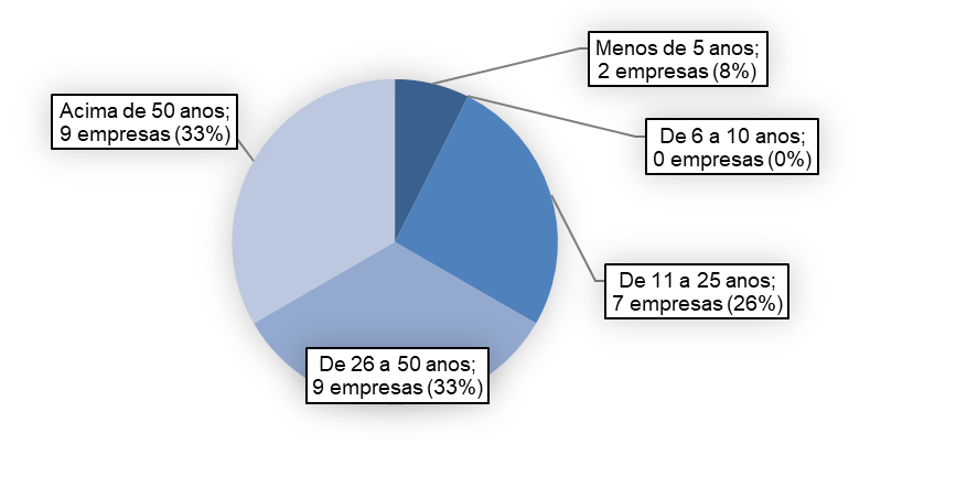 3. Tempo de vida da empresa (em anos) | < 5 | 6-10 | 11-25 | 26-50 | > 50 |