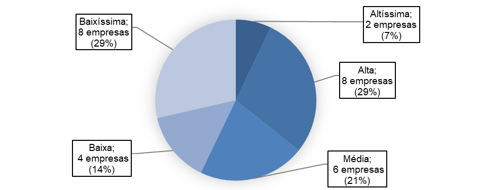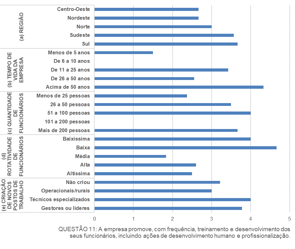 Para a questão 11, relacionada a ações de desenvolvimento humano e profissionalização, a Figura 5 evidencia que as respostas indicando baixa e baixíssima rotatividade de funcionários (< 20%) apresentaram os níveis mais elevados de favorabilidade. Observa-se também que as empresas que mais investiam no desenvolvimento humano e profissional de seus funcionários eram aquelas localizadas nas regiões Sul e Sudeste, que possuíam o maior quadro de funcionários (> 50 pessoas), que criaram postos de trabalho para técnicos especializados e gestores/líderes, e empresas com mais de 50 anos no mercado.