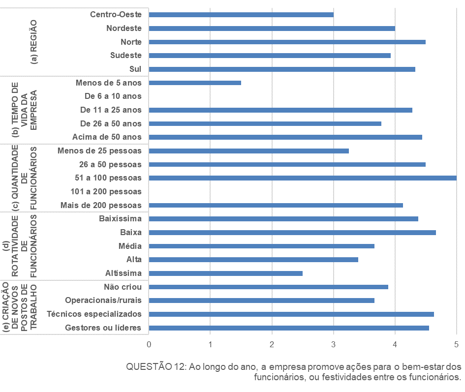 A Figura 6, relacionada à questão 12, reforça a hipótese de que empresas com quadro maior de funcionários (> 50 pessoas), mais tempo no mercado e baixa ou baixíssima rotatividade demonstraram buscar melhorar a qualidade de vida dentro da empresa, sendo as localizadas no Norte e Sul do país as mais ativas nessas ações, seguidas pelo Nordeste e Sudeste. Observa-se também que as empresas que ampliaram seu quadro de profissionais técnicos especializados e gestores/líderes foram aquelas que investiam no bem-estar de seus funcionários.