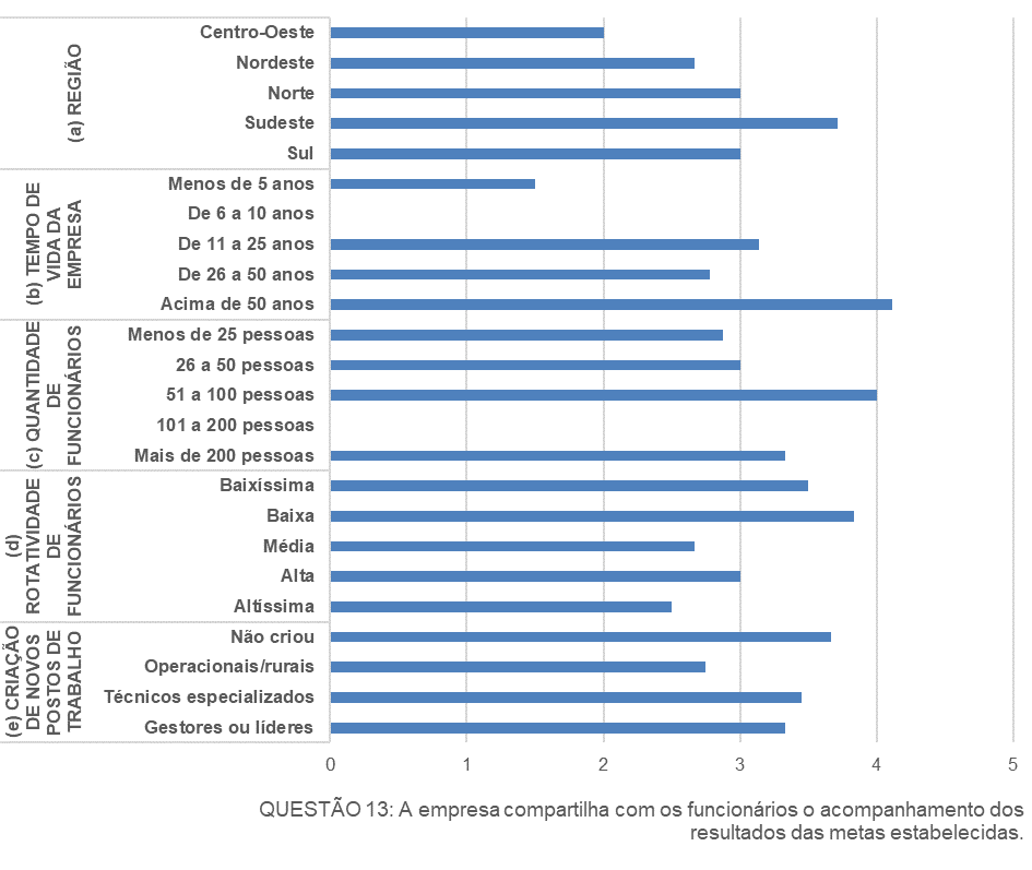 13. A empresa compartilha com os funcionários o acompanhamento dos resultados das metas estabelecidas. | 64,44% | Alta | 3,22 | 4,00 | 1,31 |