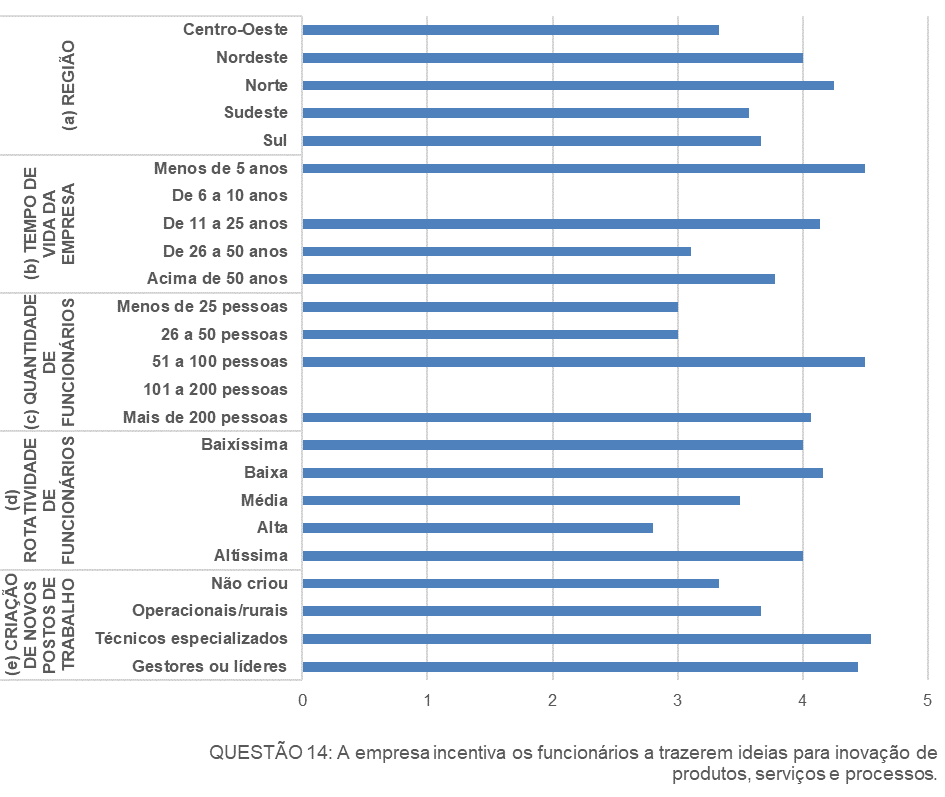 Em relação à questão 14, que tratava do incentivo a uma cultura de inovação na empresa, a Figura 8 revela que as empresas mais novas no mercado apresentaram a maior frequência de alta e extremamente alta favorabilidade. As empresas com mais de 50 funcionários nas regiões Norte e Nordeste que ampliaram o quadro com profissionais técnicos especializados e gestores/líderes em 2022 demonstraram maior favorabilidade à questão de inovação. As empresas com altíssima rotatividade anual (> 60%) e as empresas com baixa (10% a 20%) e baixíssima rotatividade (< 10%) foram as mais favoráveis quanto a apresentar ações de incentivo à inovação.